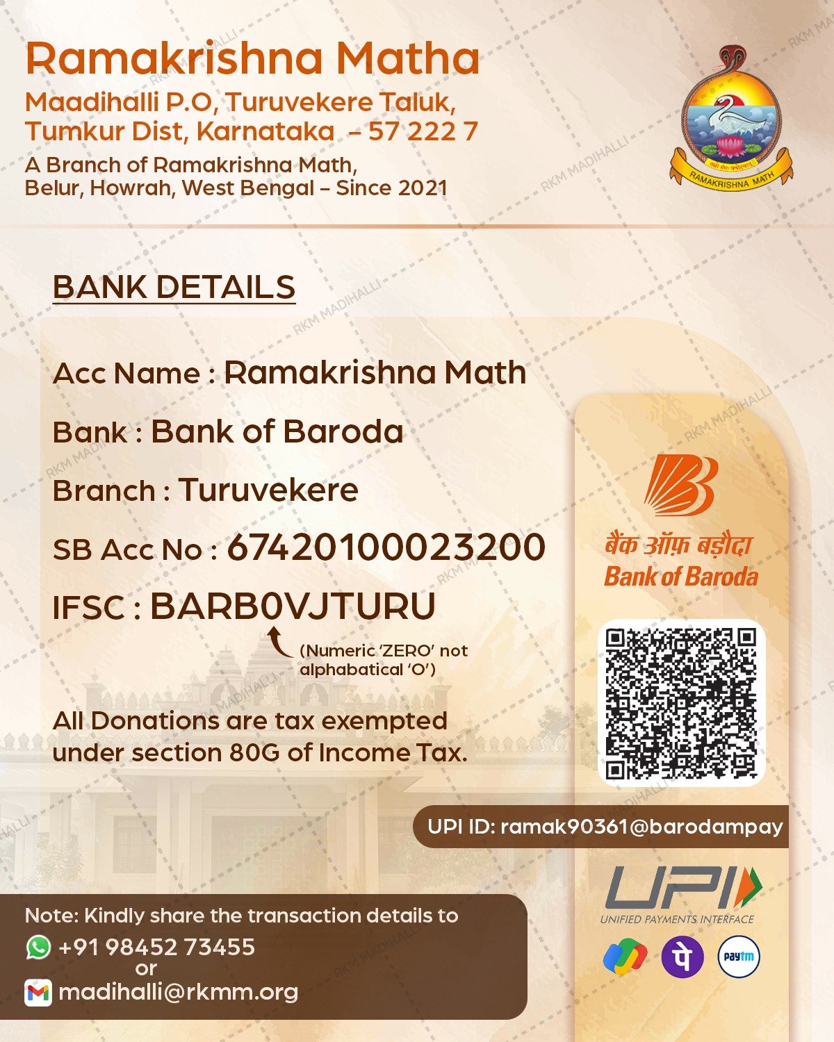 Ramakrishna Math, Maadihalli carries out its spiritual and service activities through the support of devotees and well-wishers. Contributions made to the Math help sustain its efforts in spiritual programs, education through the Vidyashala, and service to rural communities.